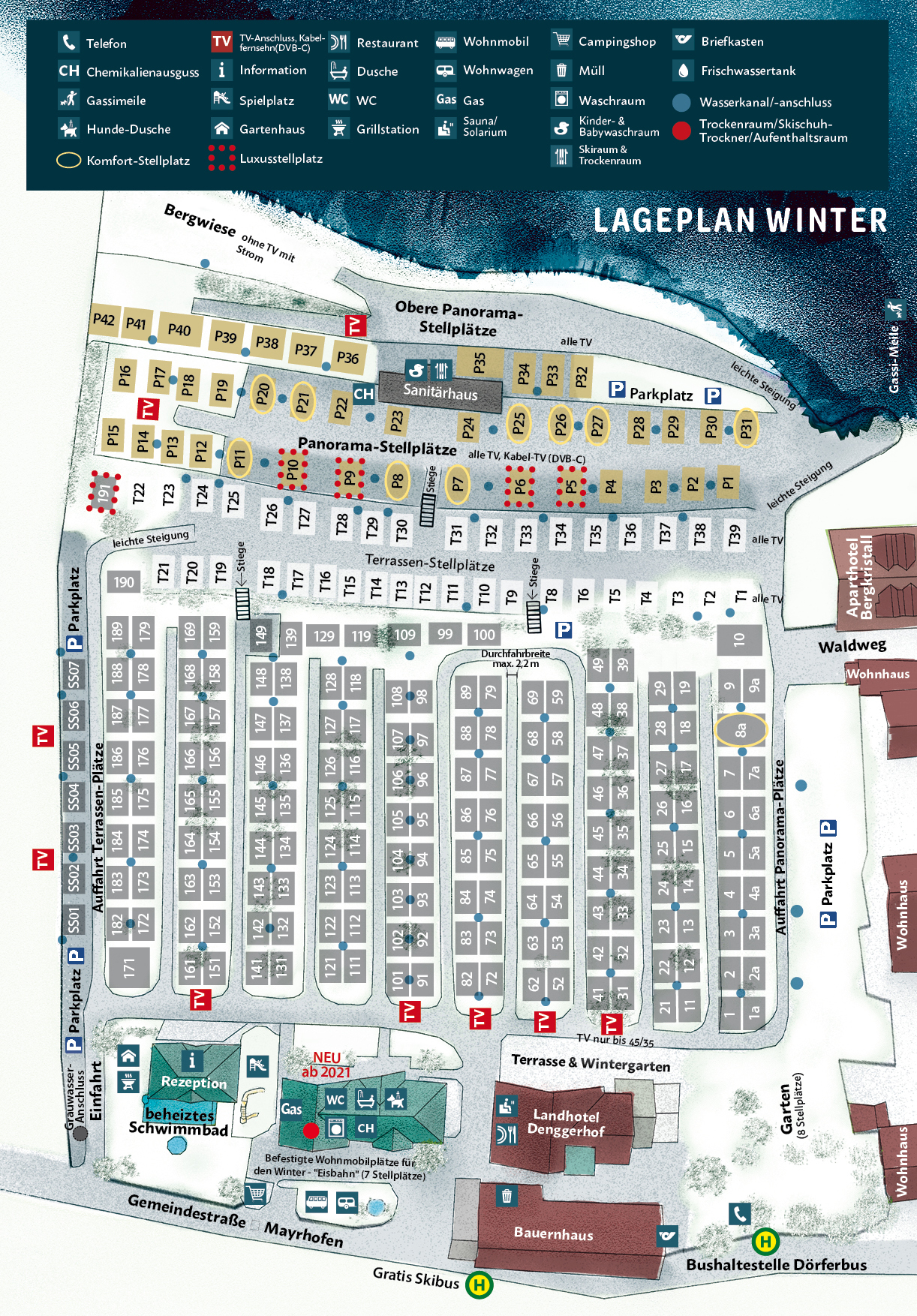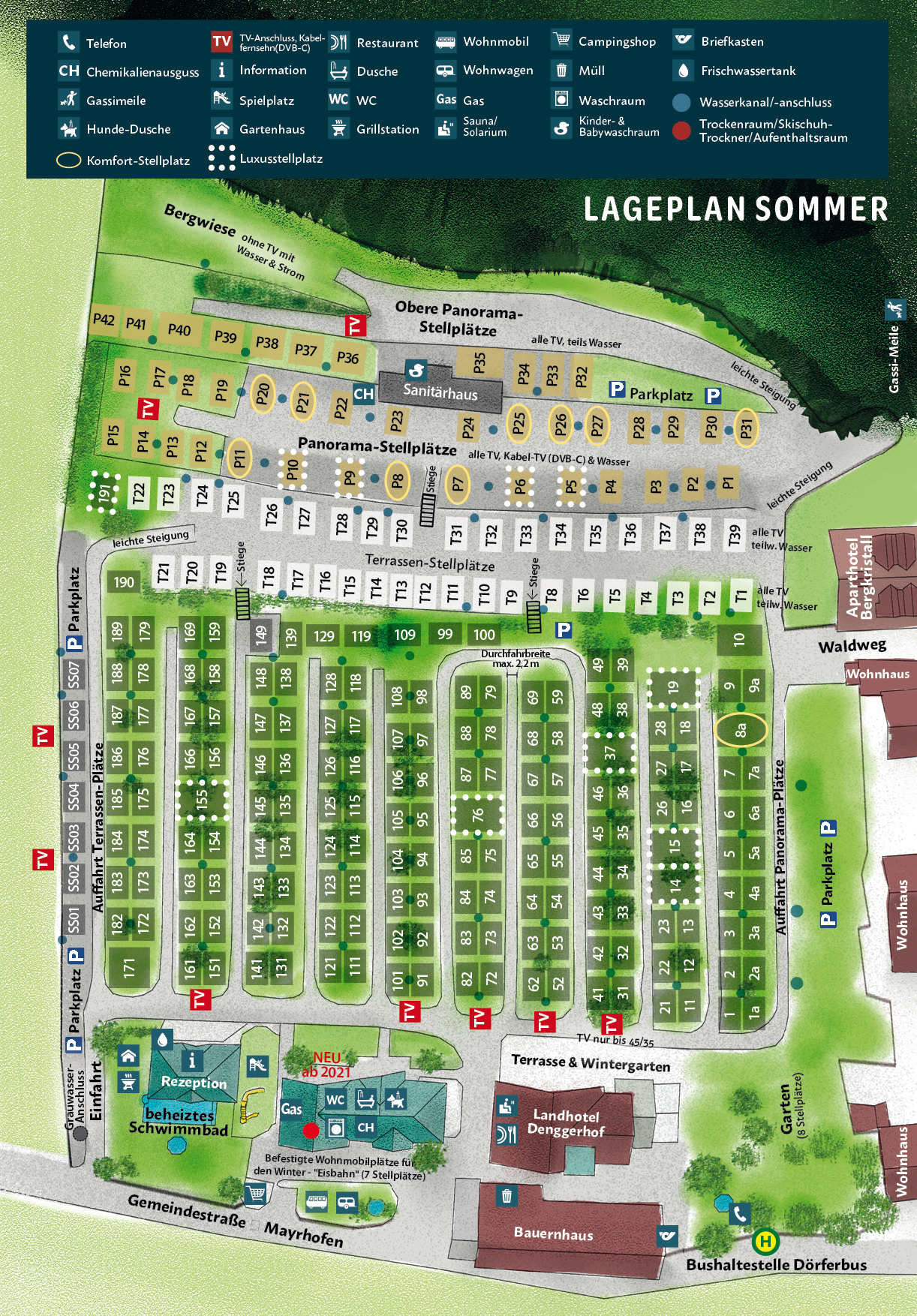 Unser Campingplatz verfügt über circa 200 Stellplätze. Diese werden unterteilt in Standardplätze, Komfortplätze und Luxusplätze.